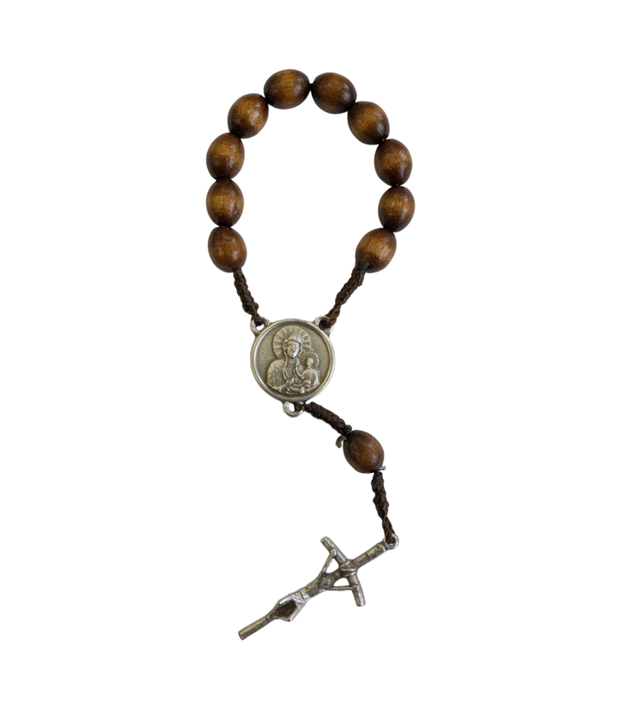 Różaniec dziesiątka z logo ŻR (jasny brąz), drewniany na sznurku z logotypem Żywego Różańca i wizerunkiem Matki Bożej Częstochowskiej (wizerunek tłoczony).